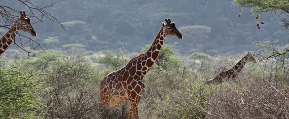 DJUR OCH FÅGLAR Typiska däggdjur för Samburu är nätgiraff, grevy’s zebra, oryxantilop och gerenuk eller giraffgasell. Den senare är särskilt anpassad för torr halvöken, och kan livnära sig utan att dricka, då den tillgodogör sig det vatten som finns i bladen. Dessutom finns elefant, lejon, leopard och buffel, babian, markatta och flera andra typiska savanndjur. Till de speciella fåglar man kan se här hör somalistruts, gampärlhöna, vitstrupig biätare, nordlig rödnäbbad toko, deckentoko, blånackad musfågel, rosentörnskata och guldbröstad glansstare. Man ser många rovfåglar, bland annat stridsörn och gycklarörn.
