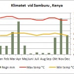 NATURTYP OCH KLIMAT Genom samburus busksavann rinner floden Ewaso Ng’iro, som betyder mörkt vatten. Den fylls på under regnperioderna april och november-december. Här råder en torr savanntyp med doumpalm (hyphaene compressa) och tamarind (extern länk) som typiska trädarter i galleriskogarna utefter floden. Från januari till oktober kan det bli 33 grader varmt eller mer, och det blir som lägst ca 15 grader (klicka på bilden till höger).